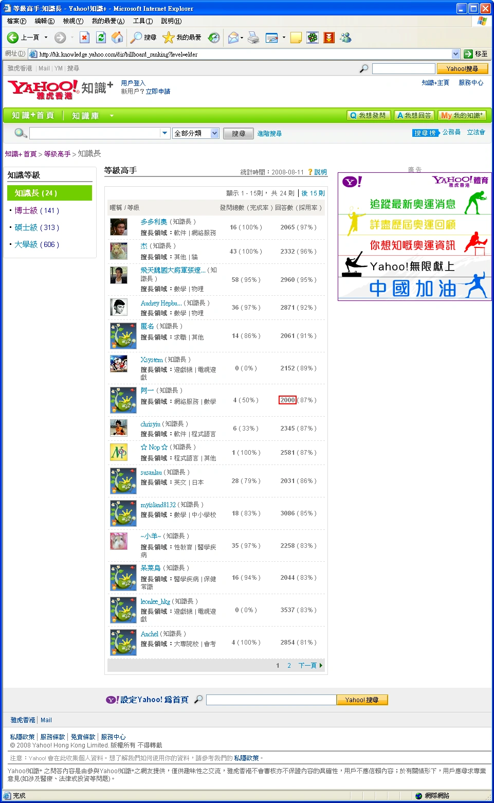 阿一,於2008年8月10日晉級成為知識長。 最完美的知識長 由於阿一晉級成為知識長的時間與更新知識長排行榜實在太接近,亦因此阿一曾在2008年8月11日更新的知識長排行榜的回答數一欄中留下「2000」這個完美的紀錄。 升級感言 對於升級為知識長,阿一個人並沒有很大反應,但由於他一向有在其自我介紹中紀錄他自己的升級歷史,所以當阿一晉級成為知識長後,他僅是在其自我介紹中留下一句「- 爆機 (Aug 10, 08, total time taken: ~1 year and 5 months)」。因此這句說話可算是阿一的「升級感言」。 另見 Yahoo!知識+ 知識長 分類: 知識長 網絡人物 Yahoo!知識+會員 除非另有註明,否則社區內容均使用CC-BY-SA授權條款。