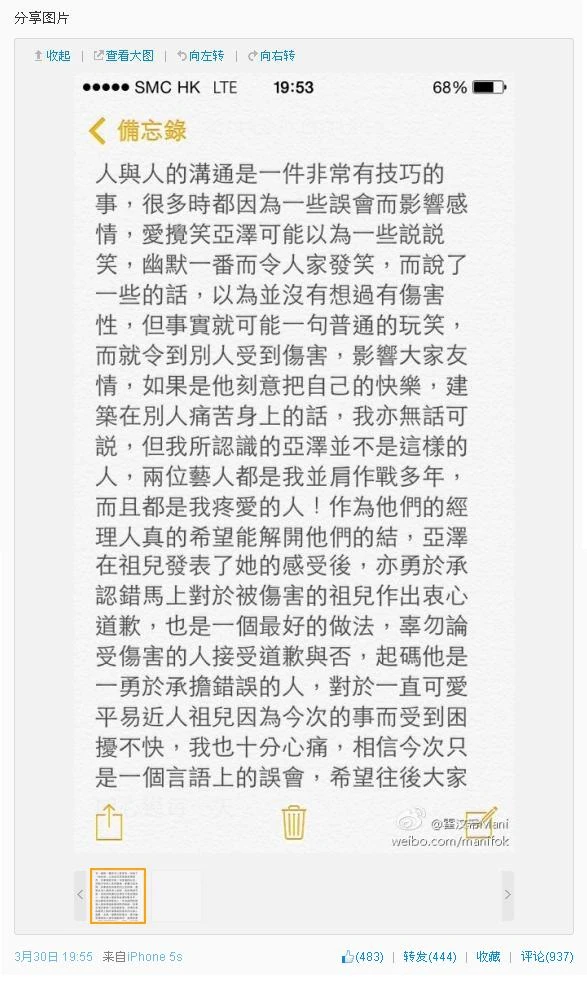 如果是他刻意把自己的快樂,建築在別人痛苦身上的話,我亦無話可說,但我所認識的亞澤並不是這樣的人,兩位藝人都是我並肩作戰多年,而且都是我疼愛的人!作為他們的經理人真的希望解開他們的結,亞澤在祖兒發表了她的感受後,亦勇於承認錯馬上對於被傷害的祖兒作出衷心道歉,也是一個最好的做法,辜勿論受傷害的人接受道歉與否,起碼他是一勇於承擔錯誤的人,對於一直可愛平易近人祖兒因為今次的事而受到困擾不快,我也十分心痛,相信今次只是一個言語上的誤會,希望往後大家開心過每一天。