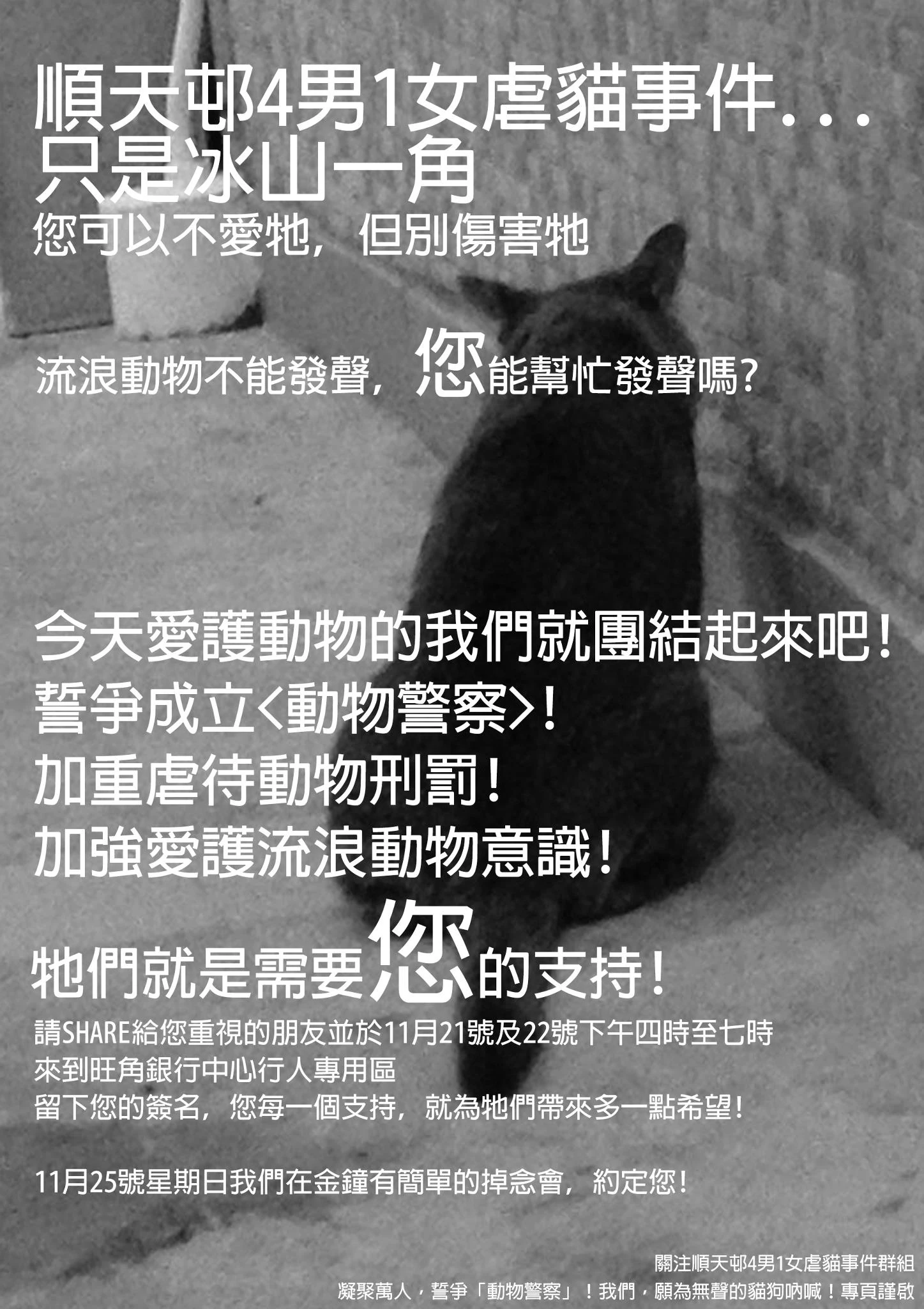 有網民自發在11月21日及22日於旺角行人專用區收集簽名,支持爭取成立動物警察專門負責偵查虐待動物案件,加強執法,對虐畜者起阻嚇作用,並在11月25日於金鐘政府總部會舉行悼念會,哀悼受虐致死的花貓。 [7]