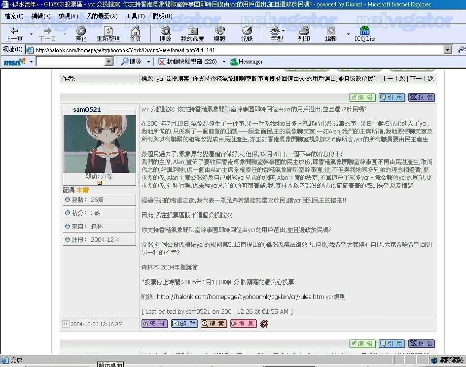 - 2004年7月初,York詢問為何不能做督察,被香港氣象聊天室督察封鎖戶口。