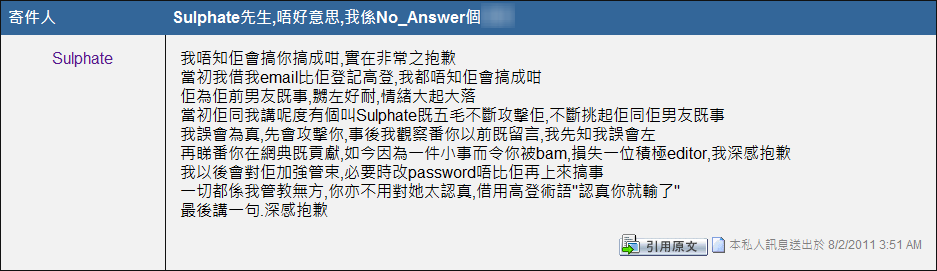 本人對此事感到非常反感, 矇羞, 無奈, 感到私隱及尊嚴被侵犯, 因為本人在討論區註冊發言只是作娛樂身心用途, 完全意想不到本人的言行會被 "維基百科香港網絡大典" 刊登出來令人人都輕易看到.