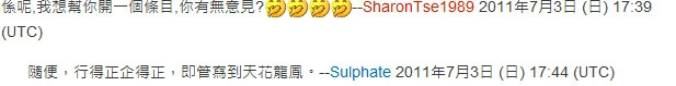 - (:)回應 我告訴你,其實這樣的上載,我也不喜歡,我更希望只收錄已在網路爆紅的內容。但有時有些劇集爆紅,就會惹來一大堆的上載,良莠不齊,你去看看《義海豪情》的條目就會明白。我這樣做,只是定下一個指標,有些時候,某人興起就會收錄一張圖(如這裡),那為什麼更值得收錄的反而不應存在?《香港電視大典》並不應只是這樣呢,那應該收錄一套劇集由籌備至播完的花絮,收視,台前幕後的介紹,對社會的影響。不過現在視典天生不良,更有興緻的人不管,我才不去管他。近來不少雜誌引述網典條目的內容,可以視作為一種肯定吧。