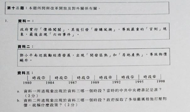 2009年會考中史題目提及「六四事件」。