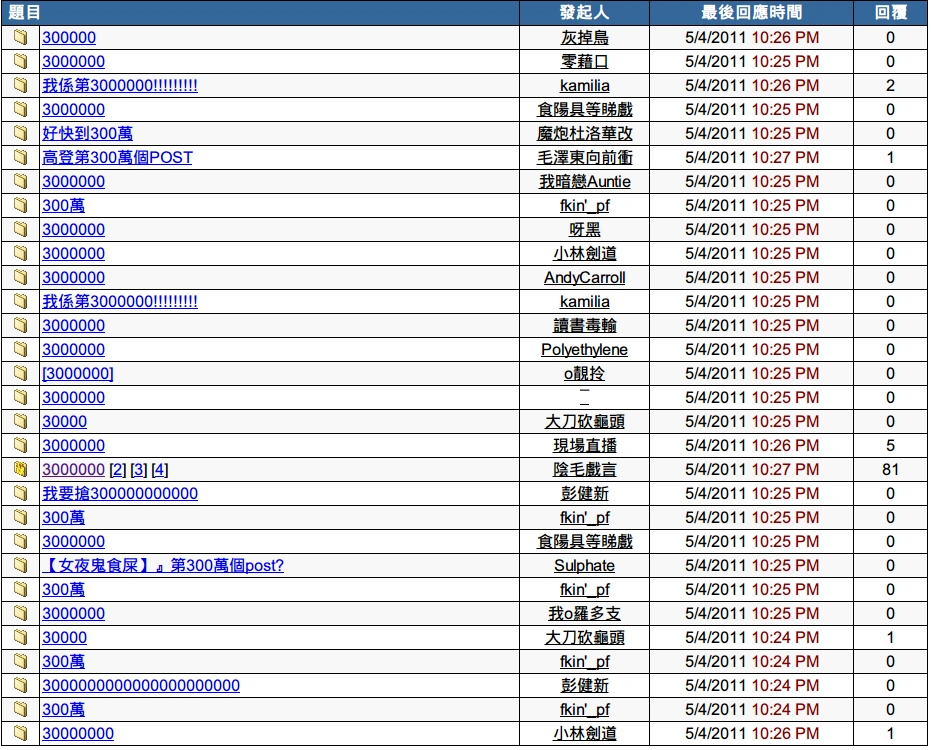 - 5月4日,高登出現第3,000,000個post,而且有會員入內張貼bam圖自爆。[61]