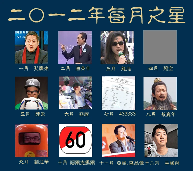 2月 陳淨心 現實人物 在電視節目使用粗俗用語,被電視台以「嘟」聲消音 詳見高登2013年2月之星選舉