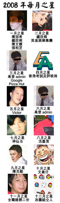| 12月 | 改圖組仝人 | 明愛醫院 | 高登團體 | 聯手製作高登icon聖誕特別版 | 否 | 詳見高登2008年12月之星選舉 |