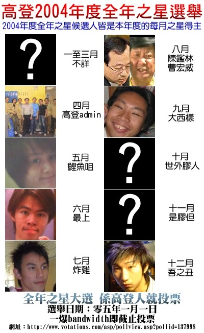 | 2月 | 特首曾蔭權 | 高登會員 | 貼圖露出馬撚 | 詳見高登2006年2月之星選舉 |