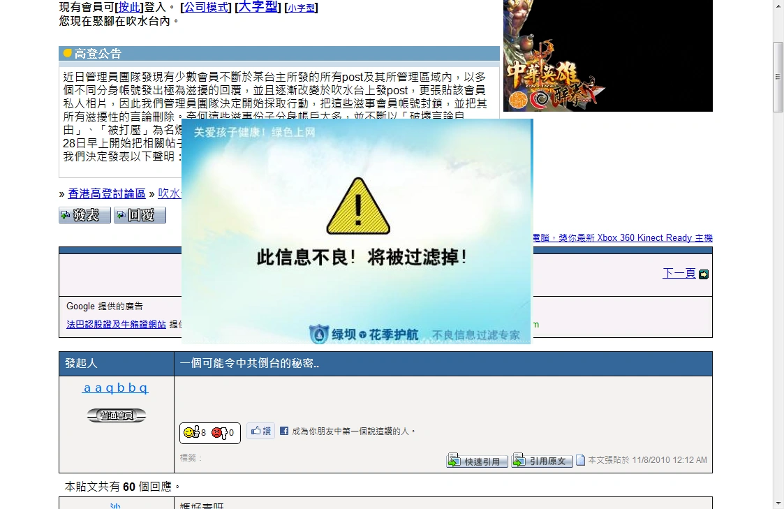大約於11月8日上午1時,高登admin開始把含有洗版意圖的帖子刪除。同日晚上大約11時開始,所有 [color= 代碼不能夠再顯示。不過有會員認為,好好利用也能夠添加討論區的色彩。[1]