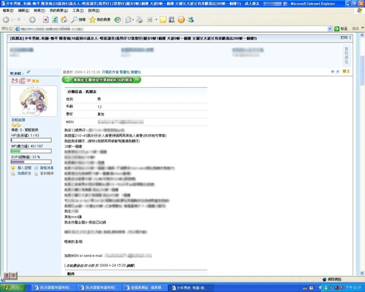 - ↑ 男童在2009年1月23日的留言(圖)(圖片含淫穢言論及不雅照)