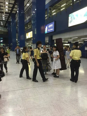 有網民於同日晚上在facebook上載一張攝於港鐵車廂的相片,相中可見關刀及長槍平放於座位前地面,長度約佔4個座位,估計已超逾港鐵的130厘米標準。而「武器」更為「真空」上車,並無任何物品包裹,部份乘客身穿武術服飾。不少網民轉載相片,並留意指「咁樣又上到車!港鐵……」,亦有網民質疑港鐵雙重標準,慨嘆「體育用品原來都有分貴賤,港鐵只准關刀上車,不准Cue棍入閘」。