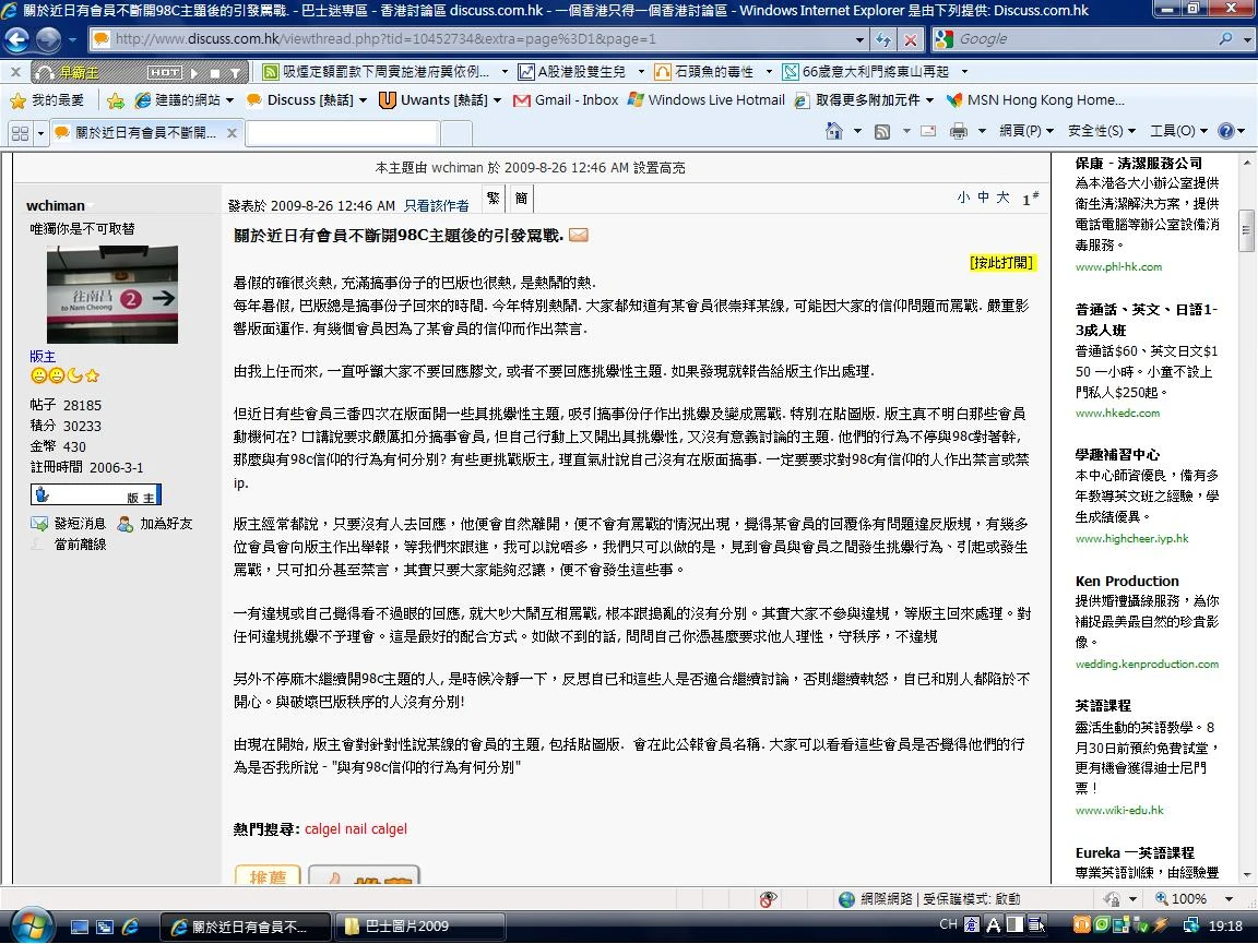 2009年8月26日,版主wchiman發出主題,警告版務人員會針對性說某線的會員的主題,包括貼圖版,並重申「不要回應膠文,或者不要回應挑釁性主題」,應使用檢舉機制,並張貼部份參與罵戰的會員名稱。版友斥其(版主)後知後覺,於98C事件沖淡後才開帖回應等於挑起98C大帝發起罵戰。 [13] [14]
