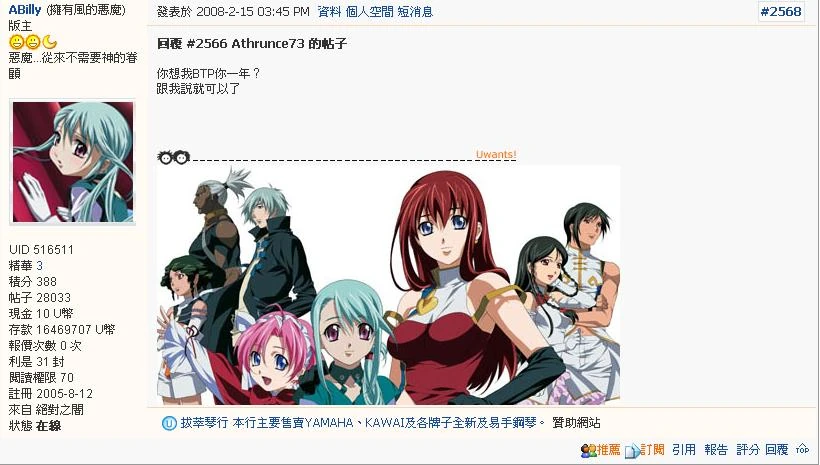 艾比利(ABilly)(UWANTS編號:516511)於2005-8-12註冊,並於同期開始濫開帖,在高達版求做版主。當時有不少會員質疑艾比利對高達UC一無所知,根本不能勝任版主工作,但因為前任版主離開而現任版主豪班長身居內地不能處理版務,最管理層同意廖化作先鋒,艾比利成為版主。