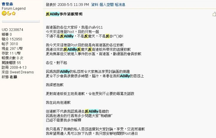 | + | '''長達兩年之久的和版主艾比利的抗爭涉及UWANTS吹水區、動漫區、意見收集區三版所有會員,竟然被視為不重要、私人糾紛;看來本大典的常客不但不常上UWANTS了解時態走向,而且對於登上花邊報紙等小消息才感興趣、趨之若鶩。 |