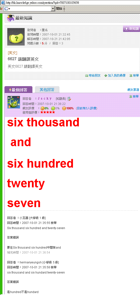發問者要求把數字6627翻譯為英文。在Yahoo!知識+經驗豐富的ch3jacky1993™深知如何可以在票選中突圍而出,於是他運用html編輯工具把答案以深紅大字回答。