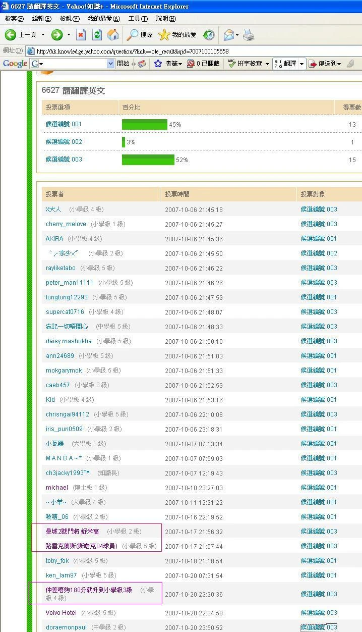 結果如ch3jacky1993™所願,問題因發問者棄置而進入票選。可是由於ch3jacky1993™的答案實在錯得太離譜,即使倚靠包裝華麗來吸引了懶人票,仍佔不到什麼優勢。