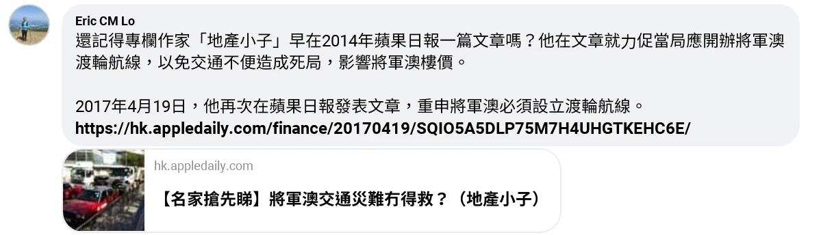 eric278喜歡不斷發表將軍澳應該興建渡輪碼頭,並開設需求、效益、盈利表現等效果嚴重成疑的過海渡輪服務的荒謬並過時言論。他所引用的理據,卻只是人人都可以寫出,甚至過時及沒有參考價值的「鱔稿」,毫無說服力。