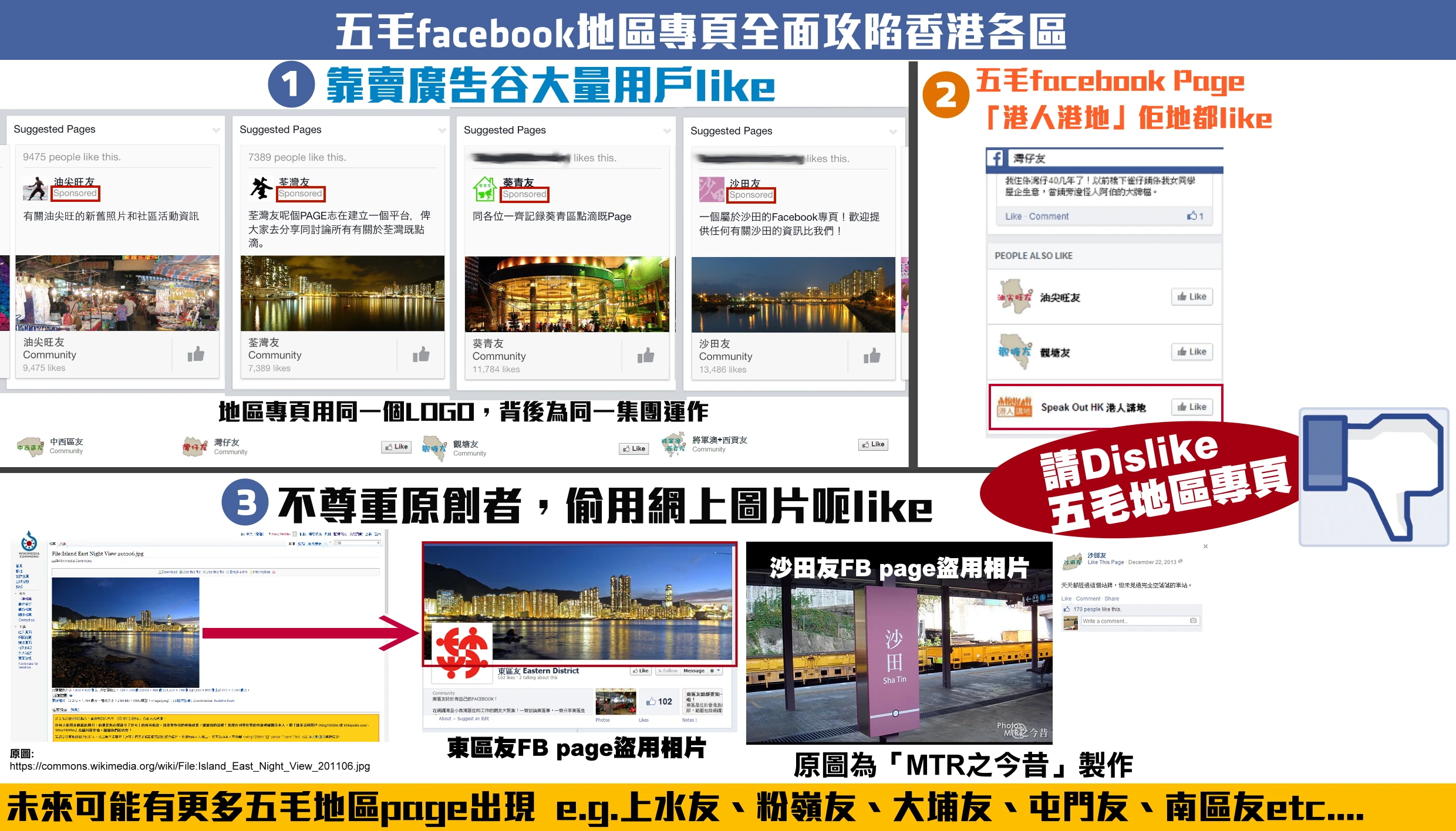 不過事實是這些所謂地區專頁是透過盜用網上的高質素圖片呃like,如相片集一樣,只將社區最好一面分享給粉絲,與地區相關的新聞卻隻字不提,內容相當欠奉。小編更發現有地區專頁會like「港人港地」專頁。