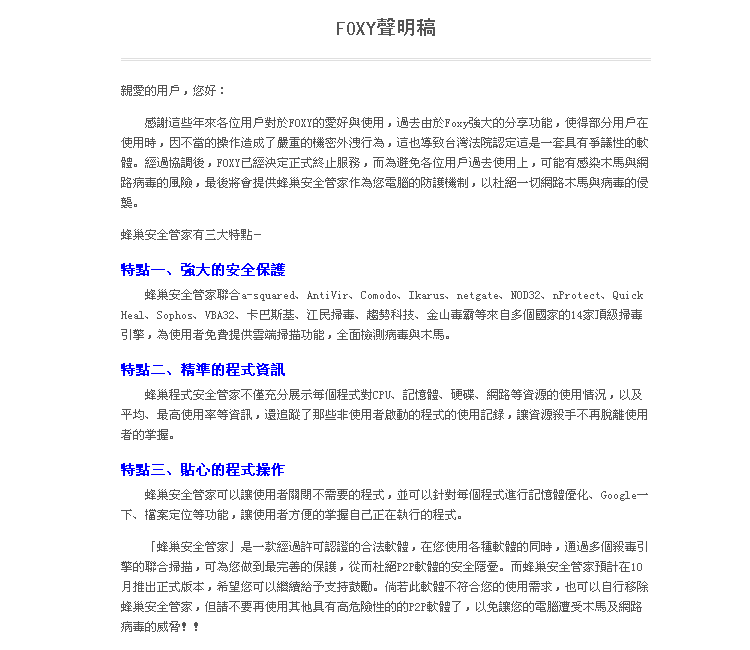 2011年10月22日,Foxy宣佈正式終止服務,用戶若開啟Foxy,程式會自行移除,移除後會自動安裝蜂巢安全管家。[1][2]雖然Foxy不能再運作,但免安裝版卻不受影響;但後者已經成為了孤兒軟件。