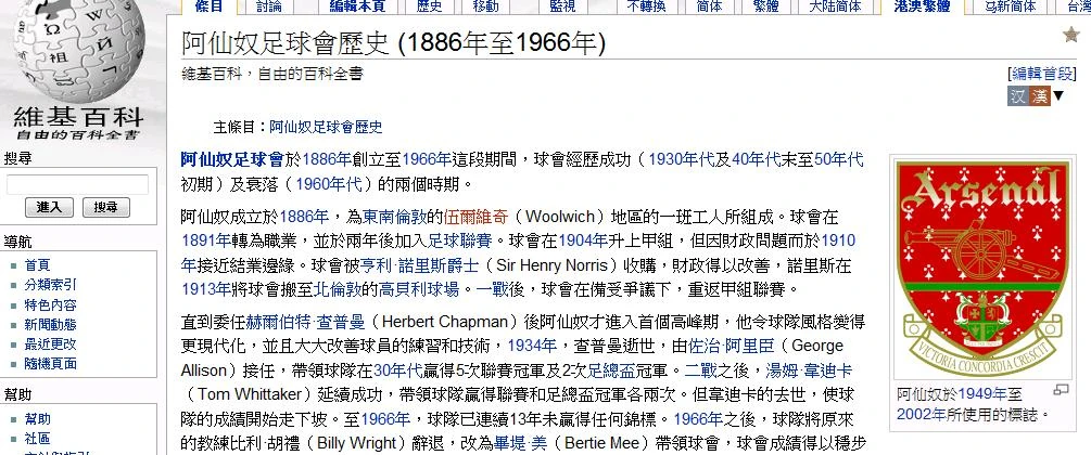 「特色條目」指的是為維基百科條目內最高水準的條目,該條目名為阿仙奴足球會歷史 (1886年至1966年)。