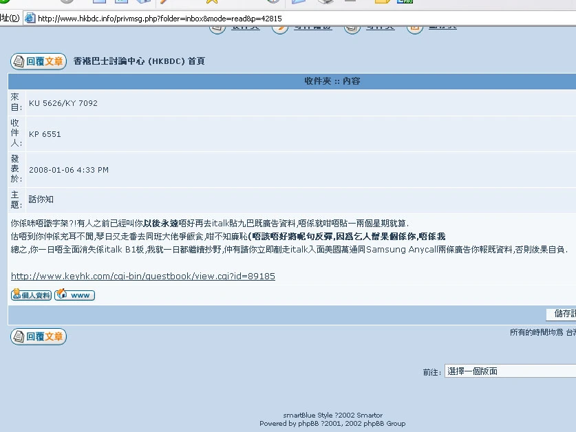 後於1月6日再有用戶名為KU 5626/KY 7092於HKBDC發私人信件至KP 6551的信箱,指他「同班大佬爭飯食咁不知廉恥」