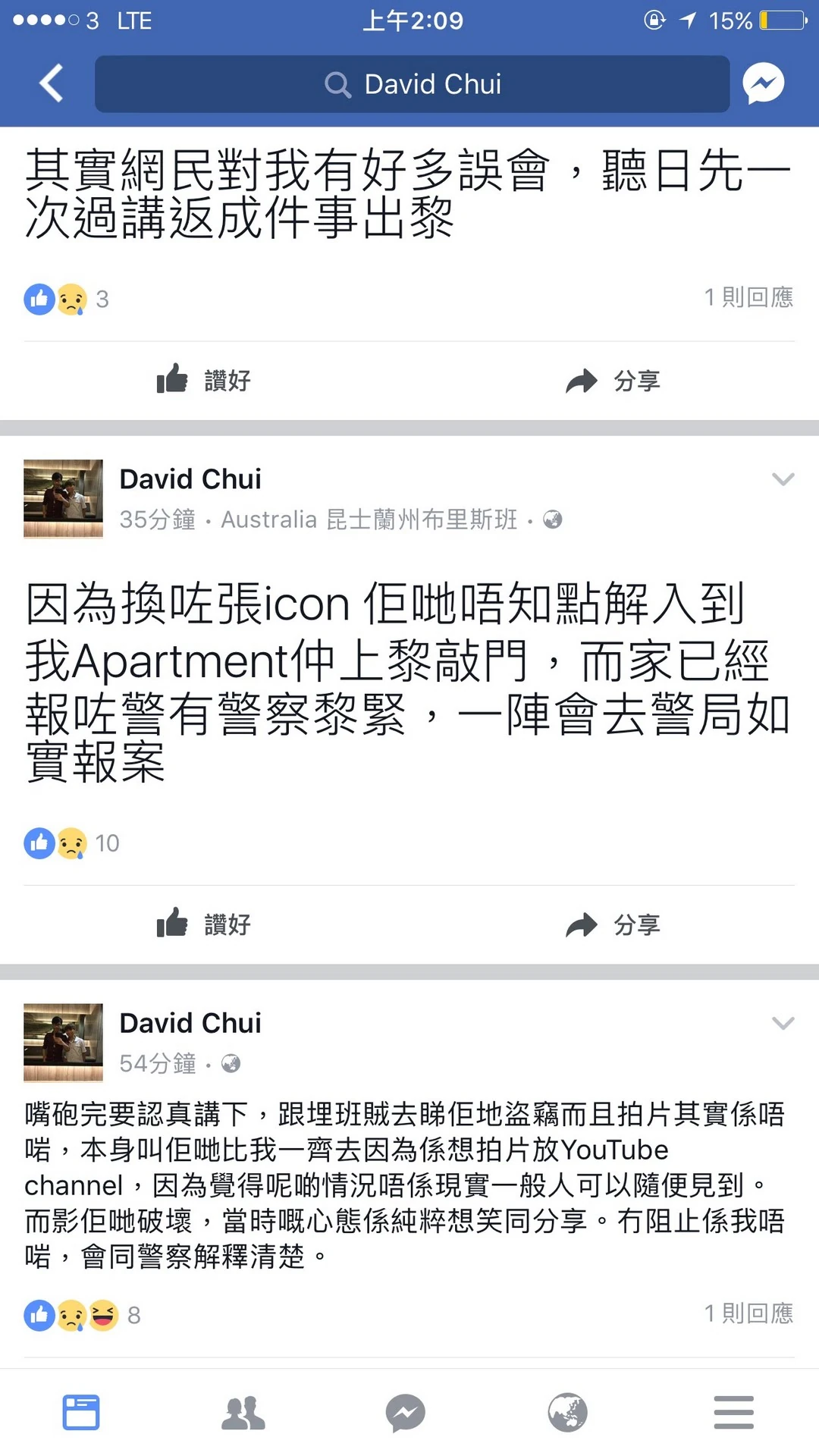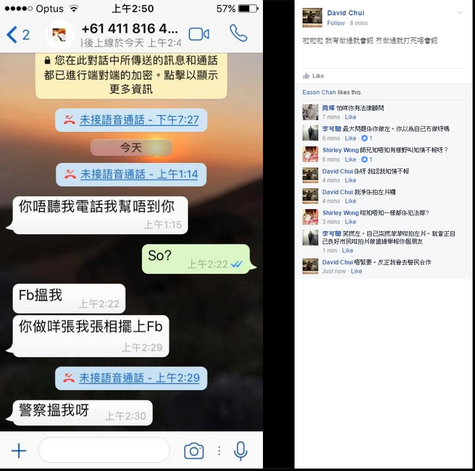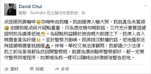 David得悉被放上連登後隨即於其Facebook公開貼文反撃,聲稱只是拍片。絕無參與過程,反重蹈覆轍,引火自婪,網民怒而起底及告知昆士蘭警方。Backup其影片,同時亦私訊當地媒體,外國媒體 7News Brisbane 亦有報導此事[1]。