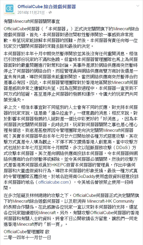 2014 年 11 月 21 日, Minecraft-HK Community ( MCHK討論區 ) 的官方服務器 OfficicalCube 在 Facebook 宣佈其服務器因遭受攻擊後要結業(見右圖)。當中有消息指結業源於該服務器的内部管理人員在意見上出現分歧而內哄,再加上早前一些玩家和團隊過於強大, ,造成服務器獨大的情況出現,其他玩家和内部管理人員不滿的情緒,抗議又不果,使其攻擊服務器。由此 Minecraft 玩家需要另找服務器重新再遊玩。