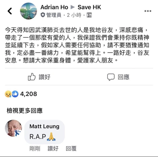 建制羣組中有人以在肺炎遇難者下留言R.A.P