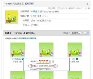 shuisee,現在為中學級5級,是Yahoo!知識+內肯定最多會員成為知識友的會員。他亦是Yahoo!知識+發問已解決問題數量最多的用戶,已解決問題數量達四千多條,且現時仍活躍於發問。
