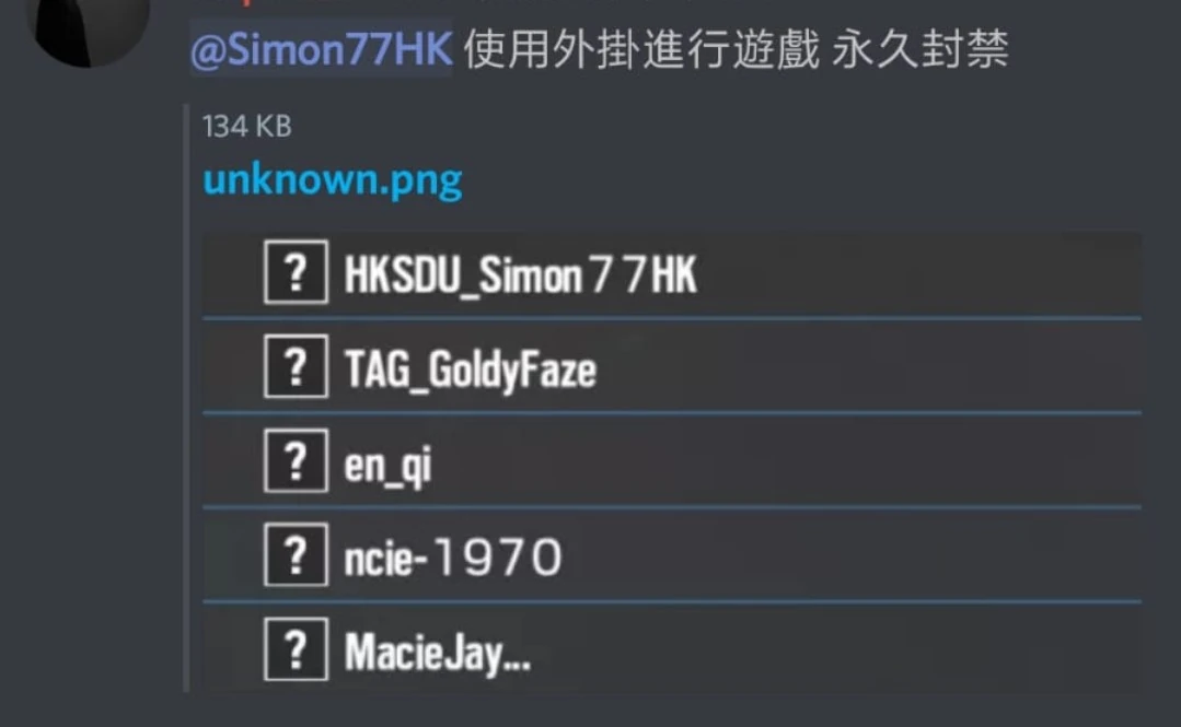 Simon77hk,全名曾俊皓,是一名外挂游戲玩家,透過Discord交流軟件得知是一名13-18歲的青年,於多個游戲中使用外挂,例如Rainbow SIX SIEGE, PLAYERUNKNOWN'S BATTLEGROUNDS, Counter-Strike: Global Offensive, 經常否定自己使用外挂,行為猶如一名小學雞,在外挂被封後會用其他類似用戶名的賬號,喜歡以大量廢話spam、裝作威脅別人( 此用戶曾使用過以下用戶名: Simon77HK VigilClutcher DokkaebiClutcher RGTeam ✪肥宅快乐水 PEPSI 出自用参数 //200 圖為現時SIMON77的用戶名 R神老师 Revolver Ware R神老师 Testing Revolver Ware R神老师 ✪肥宅快乐水 )登入,該玩家多次被認出並以不同用戶名登入個游戲平台。 (圖片來自DISCORD) 影片内容為Simon77以廢話spam、裝作威脅其他人(内容來自discord,facebook群組) https://www.youtube.com/watch?v=56nd4HtMl-I 除非另有註明,否則社區內容均使用CC-BY-SA授權條款。