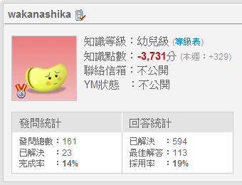 wakanashika曾是Yahoo!知識+裡分數最低的知膠,其分數為負3千多分。亦為kinki_2300[1]分身之一。不過,這其實並不是他的最低分數,因為已知他在一週內可以得到差不多四百分,所以在最低分時,他可能有負4千多分。 另見 知膠 分身 分類: 知膠 除非另有註明,否則社區內容均使用CC-BY-SA授權條款。