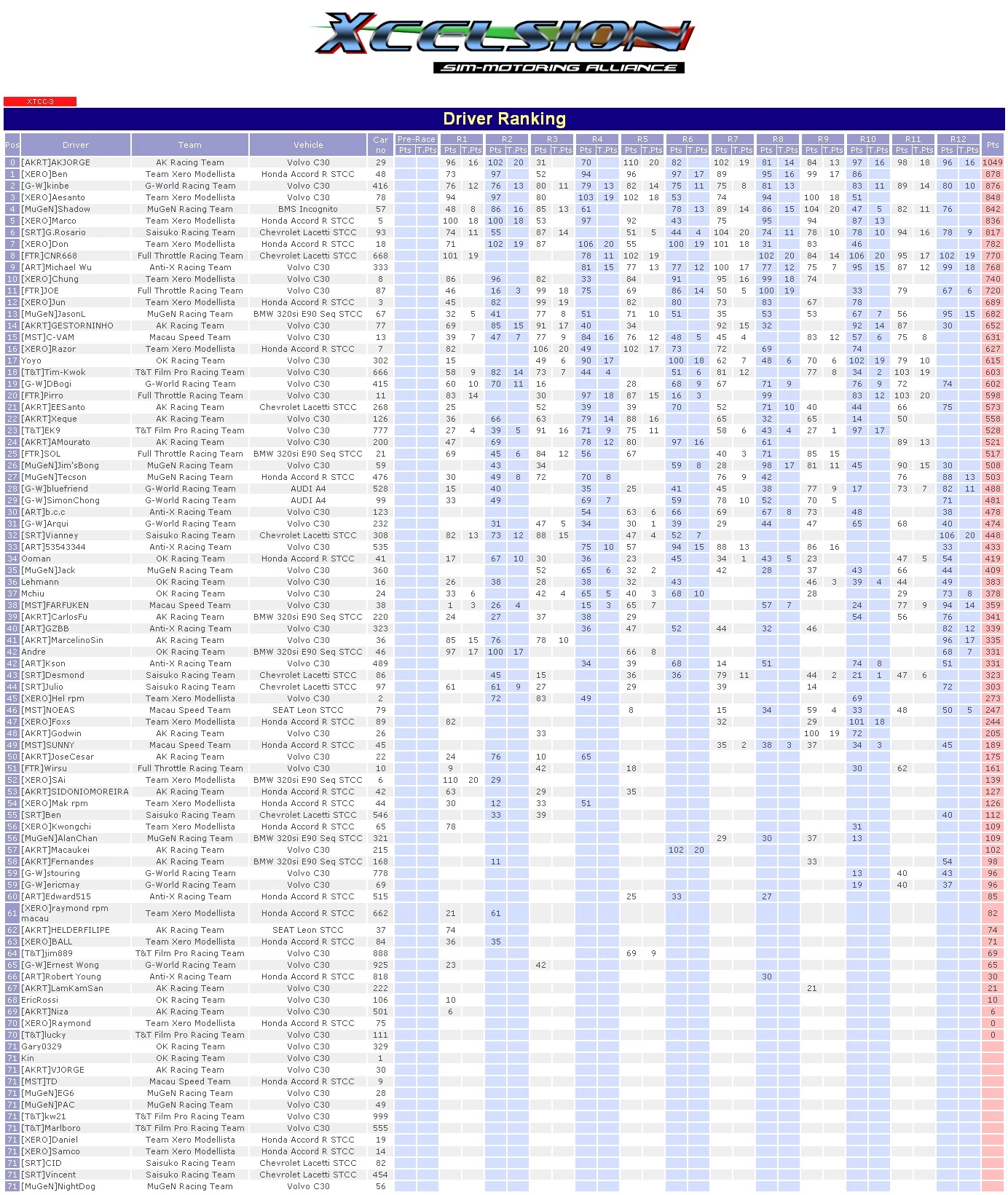 車隊 車手 1 Anti-X Racing Team Kson 2 AK Racing Team GESTORNINHO 3 Full Throttle Racing Team Pirro 4 G-World Racing Team bluefriend 5 Macau Speed Team FARFUKEN 6 MuGeN Racing Team Chairman 7 OK Racing Team ooman 8 Supreme Racing Chevrolet G.Rosario 9 T&T Film Pro Racing Team EK9