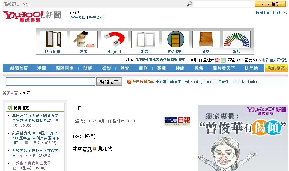 2009年8月1日「Yahoo!新聞」刊登的《星島日報》社評(網頁截圖)