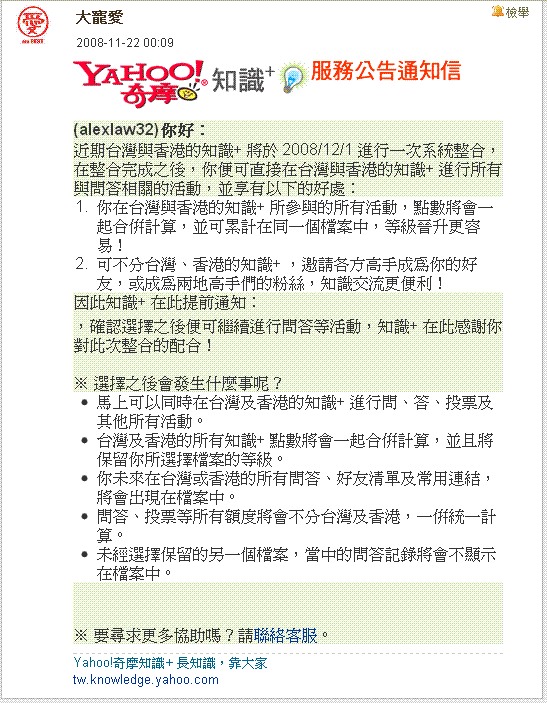 或者大家覺得上述文字只能算是純粹推測,不過,過了不久,大寵愛在網誌《知識+提供有限服務通知》告訴我們「Yahoo!奇摩知識+將於 2008/12/15 (一) 上午 10:00 ~ 下午 18:00 進行系統升級」。