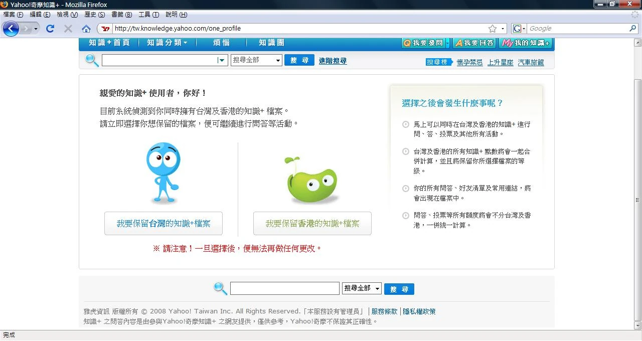 而香港Yahoo!知識+方面,由於香港Yahoo!知識+方面的系統革新工程尚未完成,因此當然未有此介面供用戶選擇是否合併。