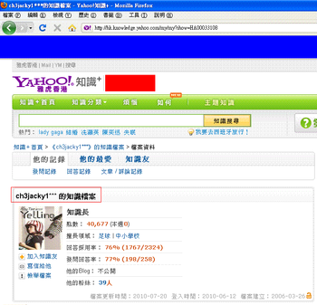 於2010年7月21日,知識長ch3jacky1993™ (Yahoo!知識+)於個人檔案中顯示的,並非其新暱稱「字裡行奸」,而是他的login name,以***隱去最後3個字元。